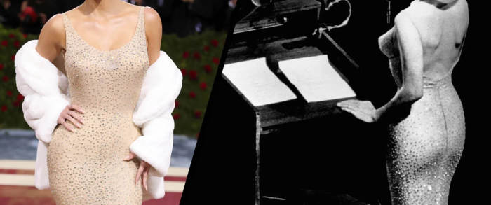 دیگر لباسی که در انتها میخواهم به آن بپردازم، لباس «تولدت مبارک، آقای رئیس» بر تن کیم کارداشیان در این مراسم بود. این لباس در سال ۱۹۶۲ توسط یک طراح جوان به نام باب مکی روی کاغذ آمد و ژان لویی فرانسوی از طراحان مشهور آن زمان طراحی شد. لباس از لحاظ درخشندگی و زرق و برق از بیهمتاترین لباسهایی است که دیده شده بود و به همین دلیل با موضوع مت گالا همسو بود. کارداشیان از یک لباس ارجینال که برای اولین بار توسط هنرمندی برای او خلق شده باشد استفاده نکرد و با این اجرای نمایش سبب حضور جسم عاطفی مرلین مونرو، جان اف کندی و مراسم تولد او شد. این لباس را درست شصت سال پیش مرلین مونرو الهه بازیگری و یکی از آیکونهای سینما در جشن تولد ۴۵ سالگی جان اف کندی، پوشیده و ترانه تولدت مبارک را برای رییس جمهور وقت خوانده بود. آنچه توجه عکاسان و دیگران را جلب کرده بود حضوری مافوق حضور بود. در اینجا به واسطه رد تنانگی عبوری از دالان موزه داریم. موزهای که سالها از لباس مونرو تحت رطوبت ۴۰ تا ۵۰ درصدی با کنترل دما نگهداری میکرد اینجا نه تنها ویژگیهای گفتمان نمایشی ما را از موزه و ویژگیهایش عبور میدهد بلکه مکان میتواند دچار استحاله از یک گذار شود. جشن تولدی که آخرین حضور پر سر و صدای مونرو در آنجا بود درست سه ماه بعد مونرو از دنیا رفت و چیزی نگذشت که کندی ترور شد. کاری که لباس و اجرای مشارکتی لباس لایولی در خود نیویورک نتوانست انجام دهد لباس کارداشیان انجام داد و کارداشیان تنها بدنی برای اجرای نمایشی از غیاب تنی بود که حاضر شد.