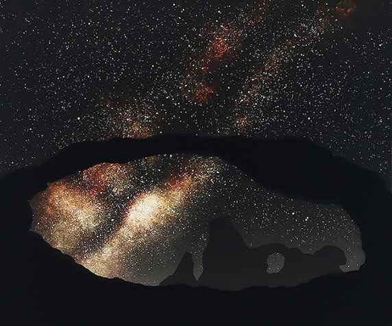 این اشکال سایهنمای سیاه موجدار در برابر پسزمینهای از آسمان نیمهشب قرار داده شدهاند که ستارگان منفرد در آن به شکل هالههای رنگارنگ راه شیری درهم ادغام شدهاند. هنرمند میگوید: «طریقهی درک ما از کیهان و نظام عالم، ذاتاً به فهم ما از نور، و نوری که ما شاهد آمدنش از عمق فضا هستیم، گره خورده است. نگاه کردن به فضا، نگاه کردن به گذشته است، زیرا نوری که از ستارگان ساطع میشود و ما میبینیم، سالهای نوری متمادی سفر کرده و از زمان و فضای زیادی گذشته است، به شکلی که امکان دارد آن ستارهها دیگر حتی وجود نداشته باشند.